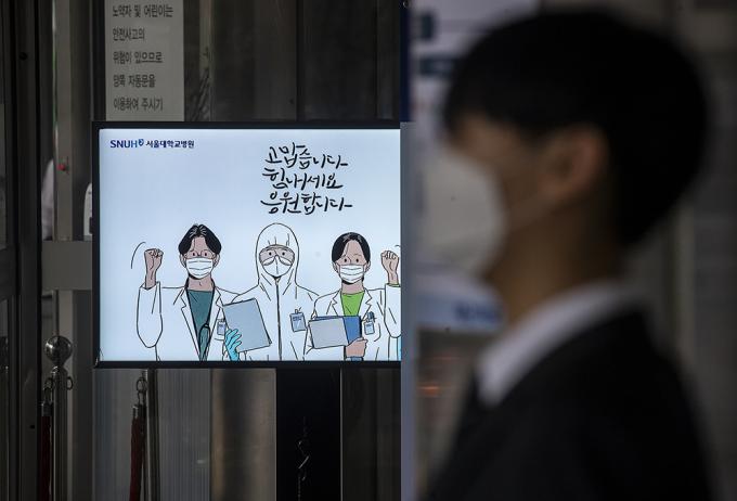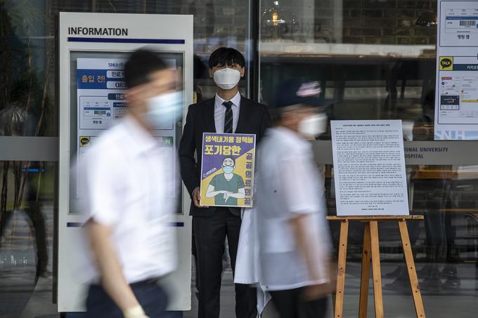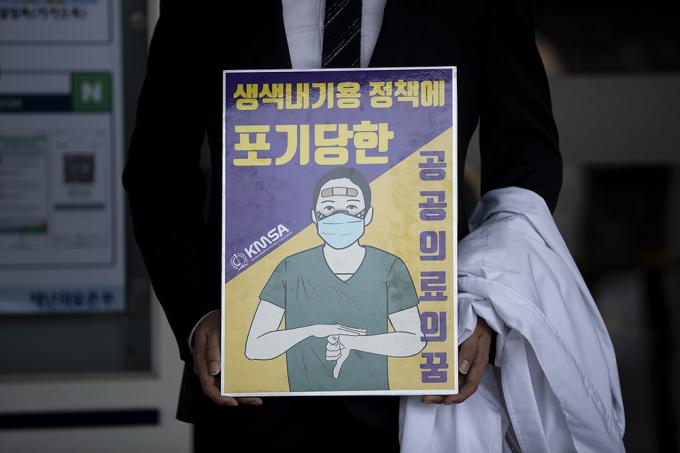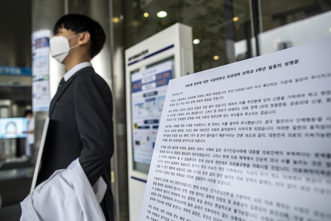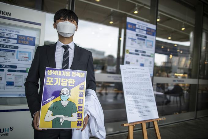 정부가 추진하는 의과대학 정원 확대 정책 등 의료정책을 반대하는 인턴, 레지던트 등 종합병원에서 수련하는 전공의들이 파업에 들어간 21일 오후 서울 종로구 서울대학교병원 본관 앞에서 대한전공의협의회 관계자가 피켓을 들고 1인 시위를 하고 있다.