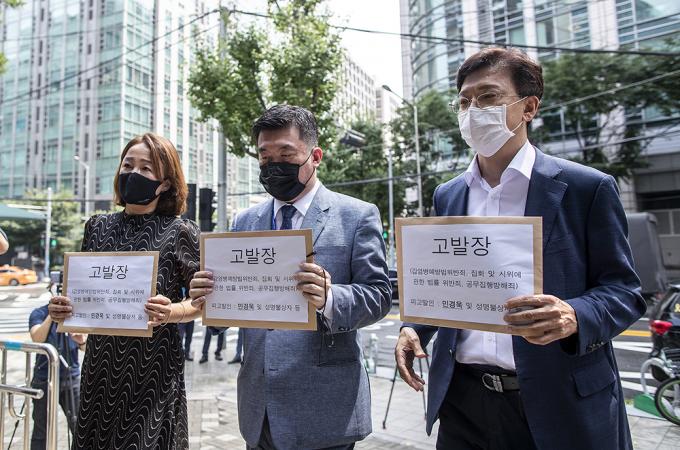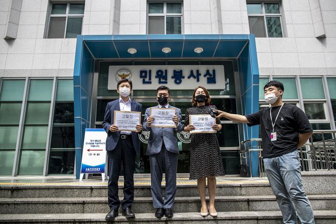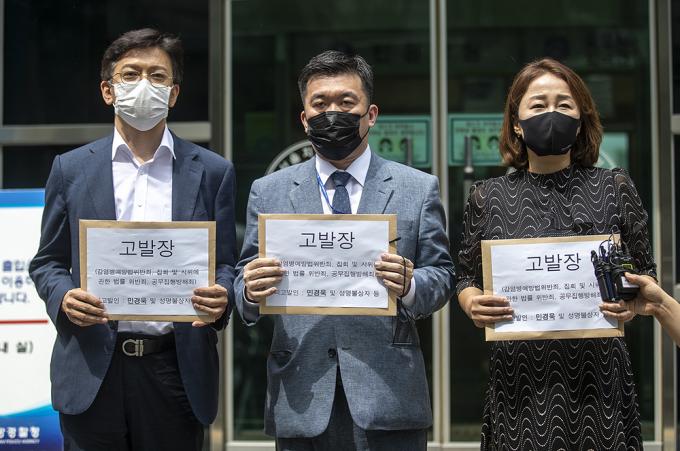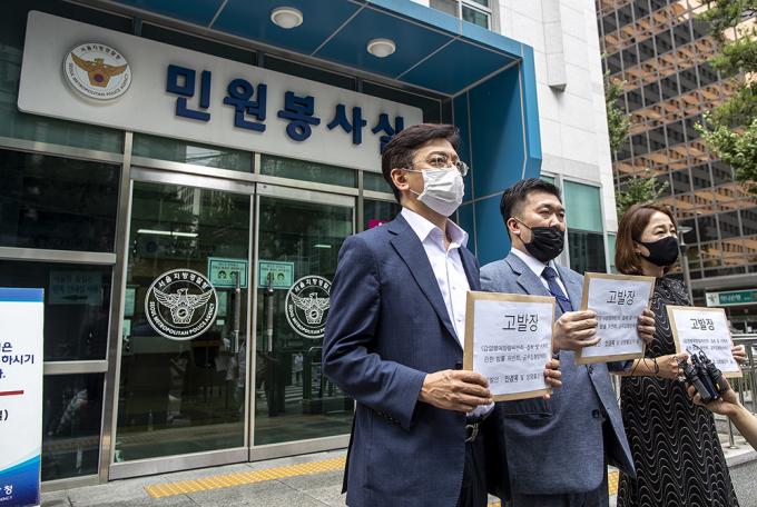 최현 박주민 후보 선거대책본부 상황실장, 현근택 변호사, 이재정 더불어민주당 의원 등 더불어민주당 박주민 당 대표 후보 측이 21일 오후 서울 종로구 서울지방경찰청에서 기자회견을 열고 민경욱 미래통합당 전 국회의원을 감염병의 예방 및 관리에 관한 법률위반 혐의로 고발장 제출하는 기자회견을 하고 있다.