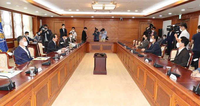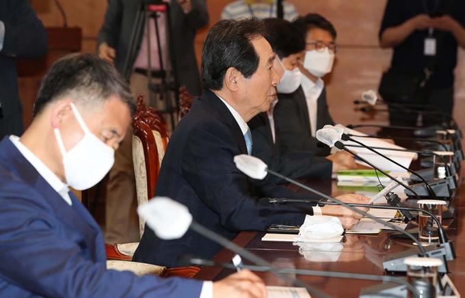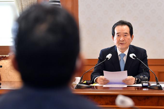 정세균 국무총리가 24일 서울 종로구 정부서울청사에서 최대집 대한의사협회장과의 면담 중 모두발언을 하고 있다. 앞서 의협은 정부의 의대 정원 확대 정책 철회를 요구하며 오는 26일부터 사흘간 2차 총파업을 예고했다.