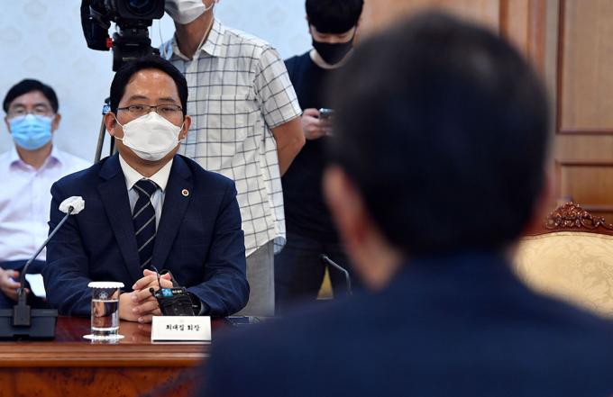 최대집 대한의사협회장이24일 서울 종로구 정부서울청사에서 정세균 국무총리와의 면담에서 정 총리의 모두발언을 듣고 있다.
