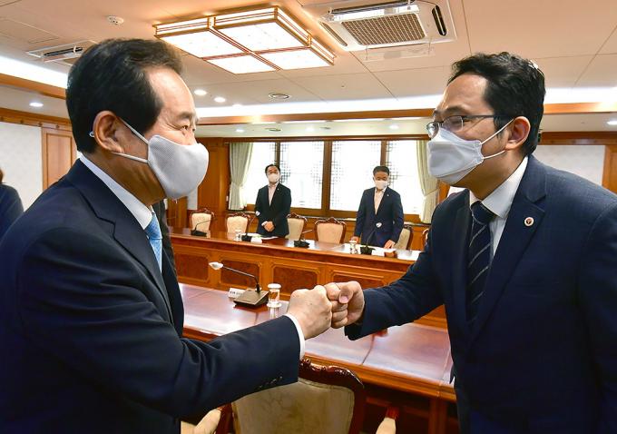 정세균 국무총리가 24일 서울 종로구 정부서울청사에서 최대집 대한의사협회장과의 면담에 앞서 주먹인사를 하고 있다.