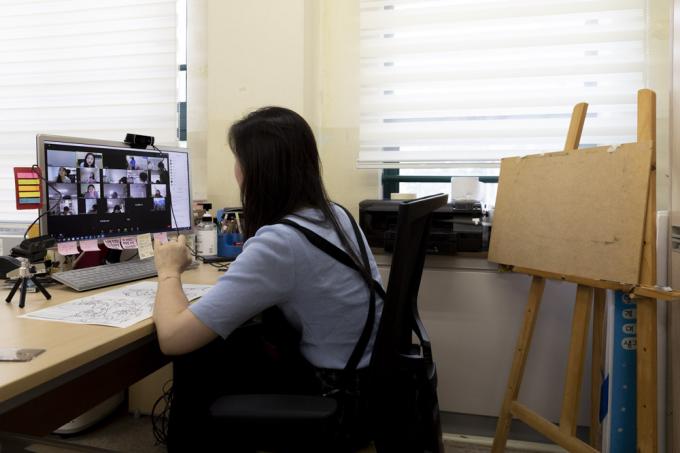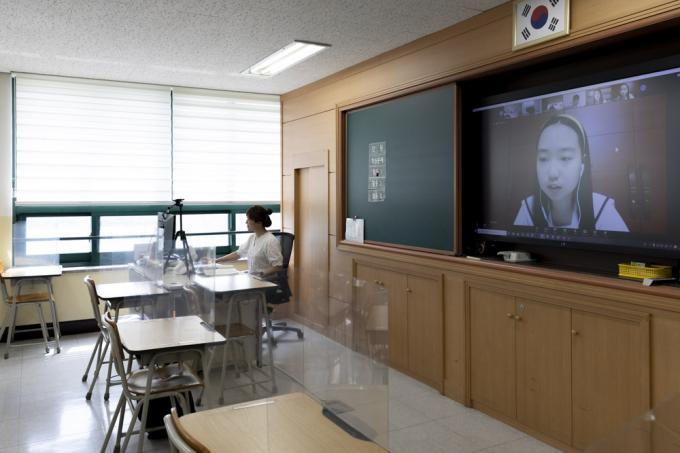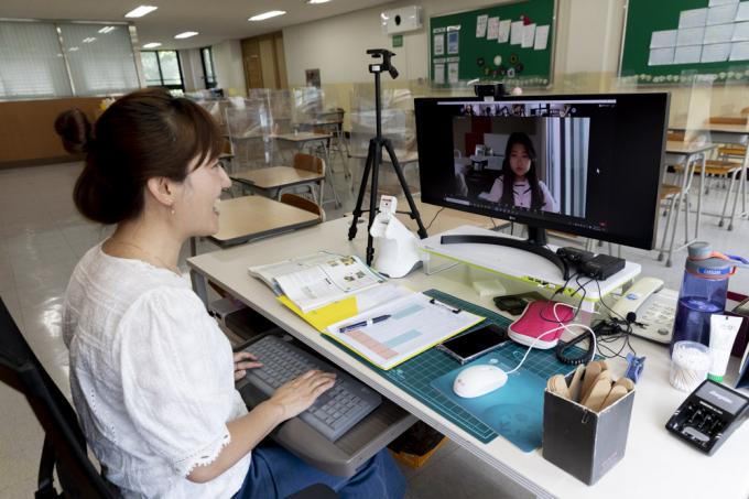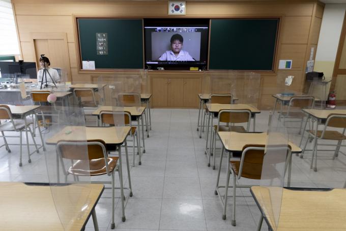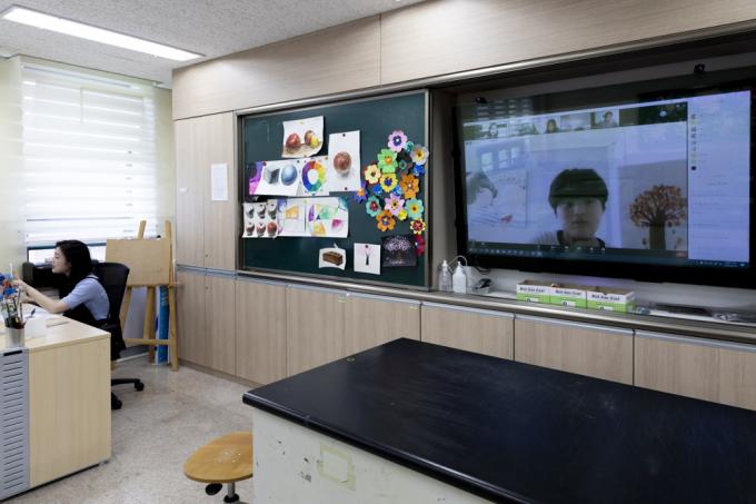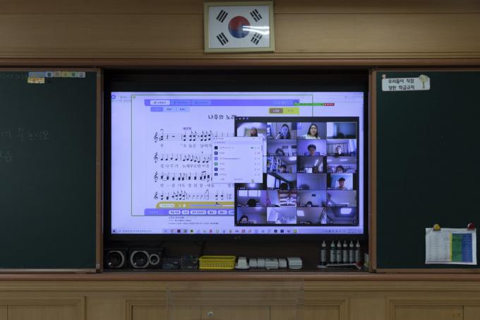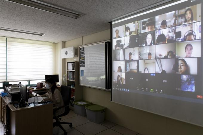 코로나19 확산세가 지속됨에 따라 수도권 지역 유치원과 초·중·고교, 특수학교가 전면 원격수업으로 전환한 26일 오후 서울 노원구 화랑초등학교 교실에서 교사가 학생들과 온라인 화상수업을 진행하고 있다.