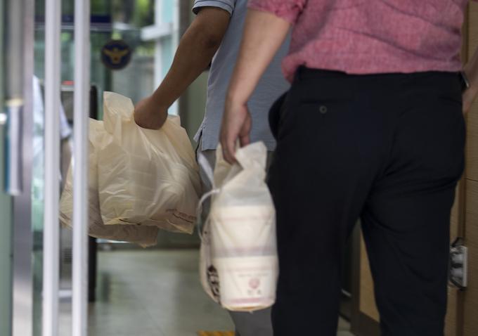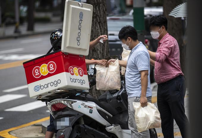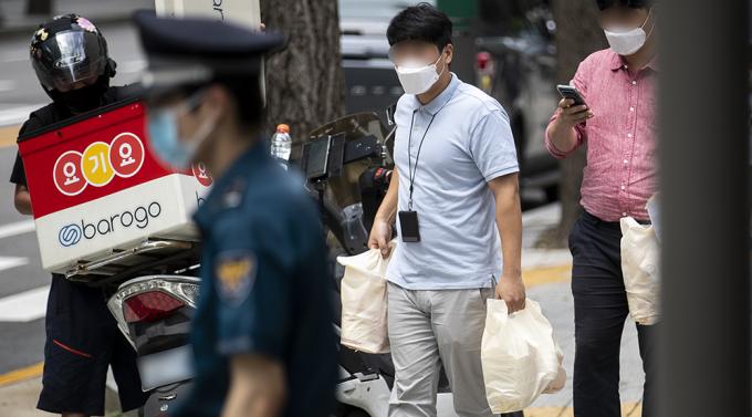 수도권을 중심으로 코로나19가 재확산하고 있는 가운데 28일 오전 서울 종로구 서울지방경찰청에서 직원들이 배달음식을 가져가고 있다. 최근 사회적 거리두기 2단계 일환으로 배달음식 및 도시락으로 점심을 해결하는 직장인이 늘어나고 있다.