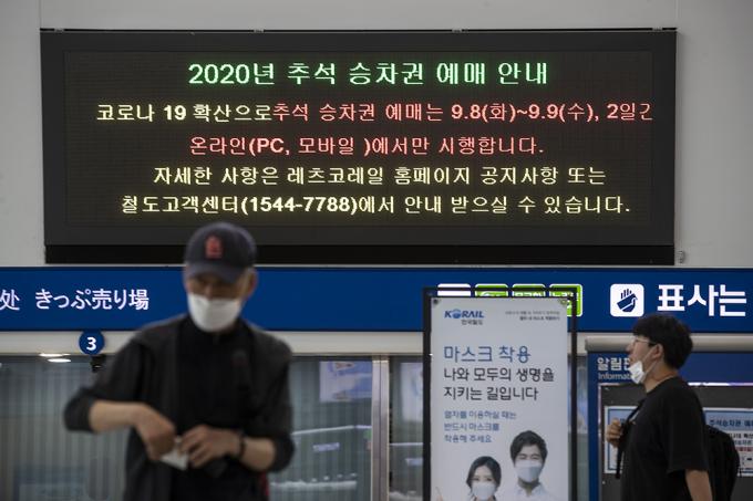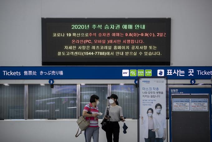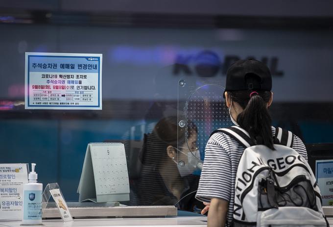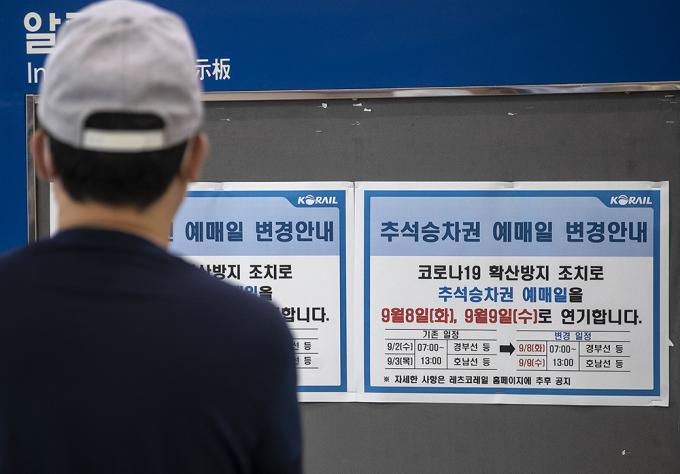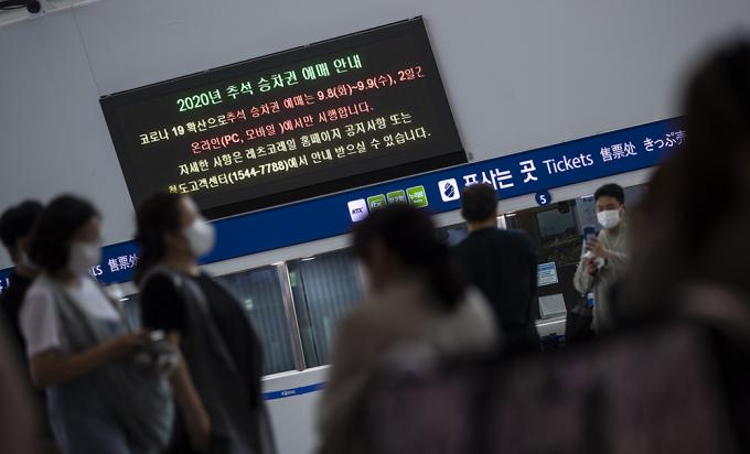 2일 오후 서울 용산구 서울역 전광판에 추석 승차권 예매일 변경 안내문이 붙어있다. 코레일은 코로나19로 인한 사회적 거리두기 2.5단계 시행에 따라 추석 승차권 예매를 9월 2~3일에서 8~9일로 미루기로 했다. 추석 승차권 예매는 현장발권이 아닌 온라인(PC, 모바일), 전화로 가능하며 코로나19 확산 방지 차원에서 창 측 좌석만 발매하기로 했다.