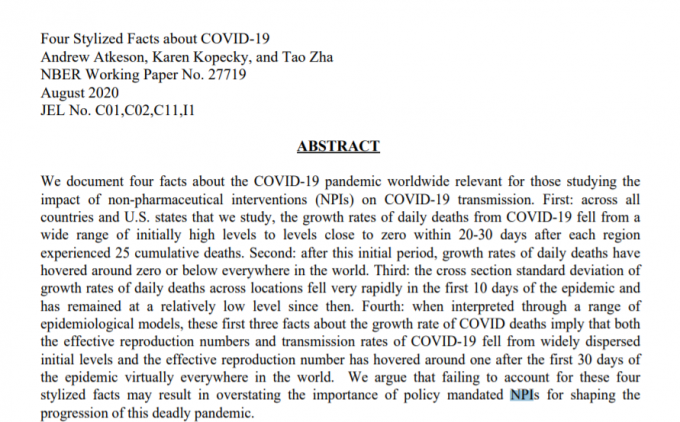 이에 NBER 연구진들은 록다운, 통행금지, 마스크 착용과 같은 '비약물적 통제'가 바이러스의 감염 방지와 사망자 감소에 영향을 주지 못한다고 결론 내렸다.