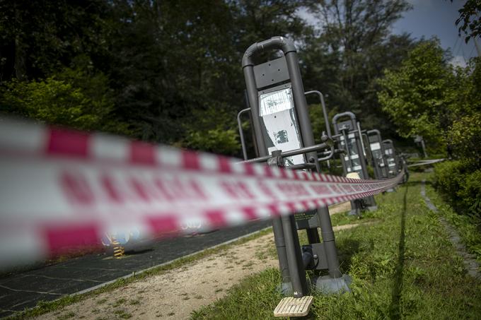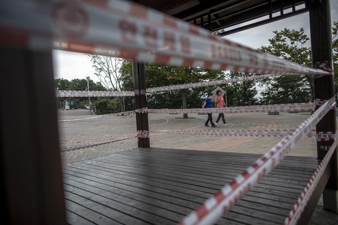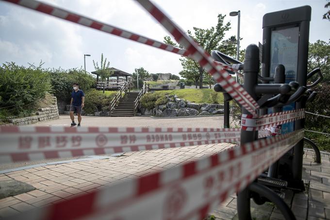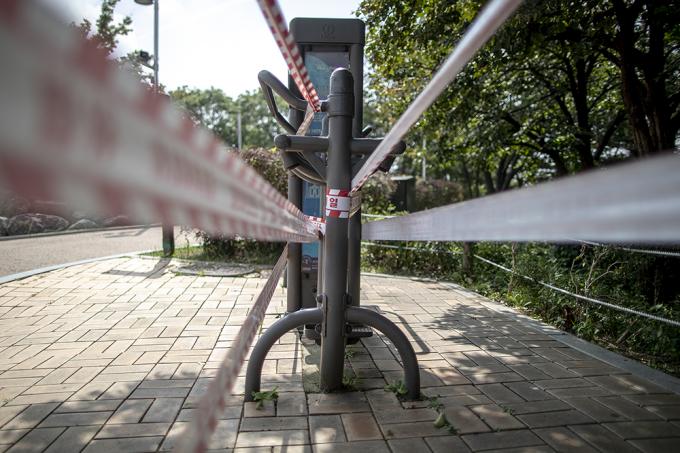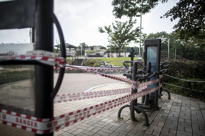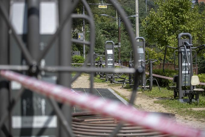 수도권 사회적 거리두기가 2.5단계에서 2단계로 완화되어 시행중인 15일 오후 서울 종로구 청운공원 운동시설, 소위 '산스장(산에 있는 헬스장)'은 폐쇄돼 있다. 서울시는 14일 브리핑을 통해 정부의 수도권 사회적 거리두기 2단계 완화로 식당, 프랜차이즈 커피전문점, 실내헬스장 운영 등 일부 강력한 방역조치들은 중단됐지만 한강공원의 일부 밀집지역 통제는 그대로 유지한다고 밝혔다.