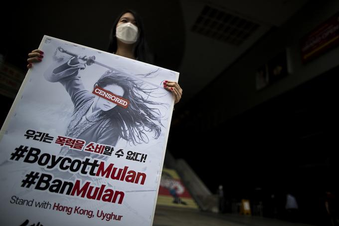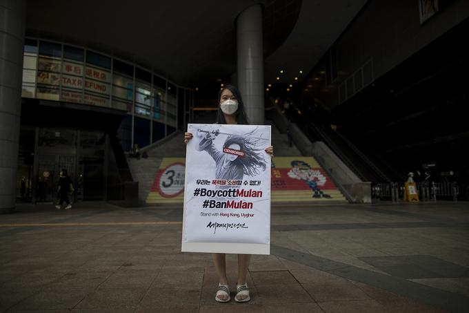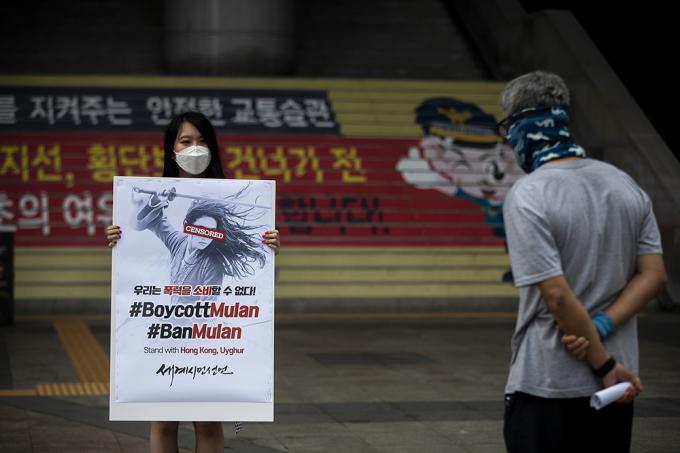 이설아 세계시민선언 공동대표가 17일 오후 서울 용산역 앞에서 영화 '뮬란' 보이콧 피켓을 들고 1인 시위를 하고 있다. 오늘 개봉한 디즈니 신작영화 '뮬란'은 주연배우 유역비가 홍콩 시위를 탄압하는 경찰에 대해 지지하는 발언을 했다는 이유로 보이콧 운동이 벌어지고 있다.