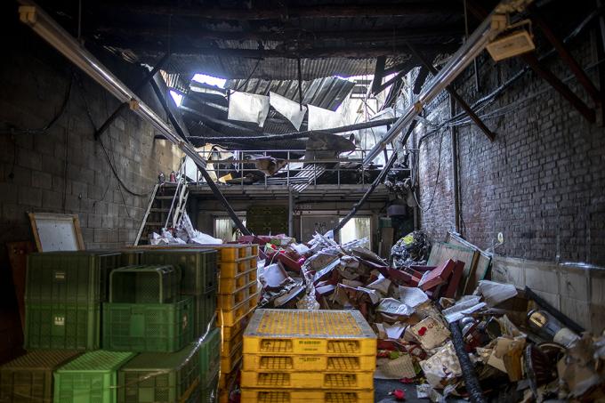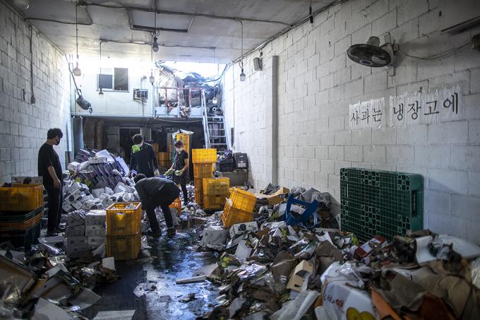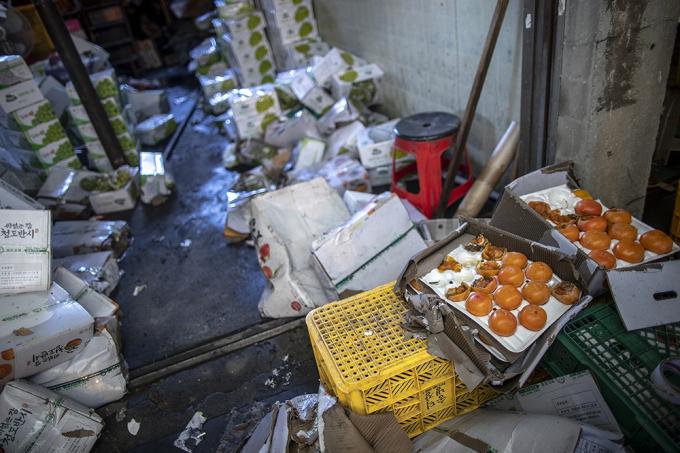 22일 오전 전날 큰 화재가 발생한 서울 동대문구 청량리 청과물시장에 검게 그을리고 뭉개진 배와 감 상자가 쌓여있다.