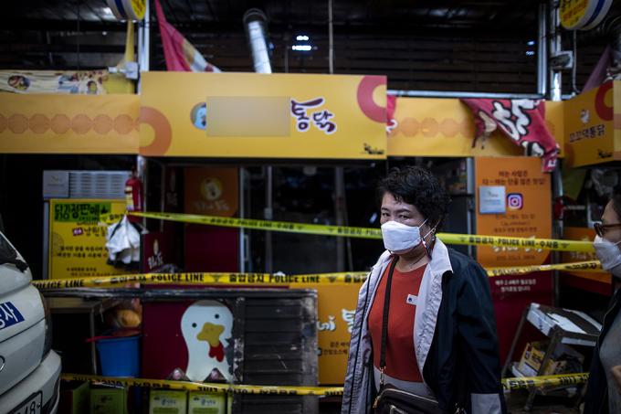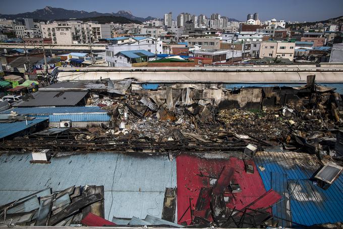 22일 오전 전날 큰 화재가 발생한 서울 동대문구 청량리 청과물시장에서 상인들이 피해 현장을 정리하고 있다.