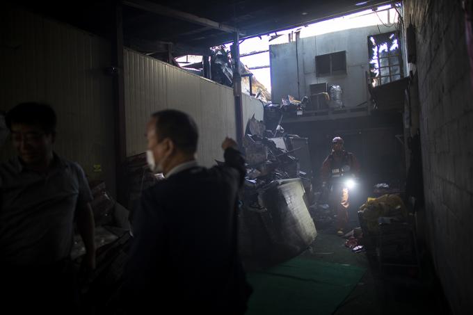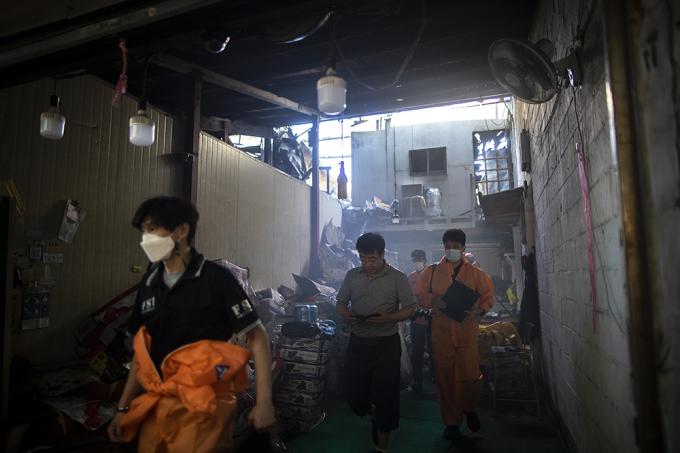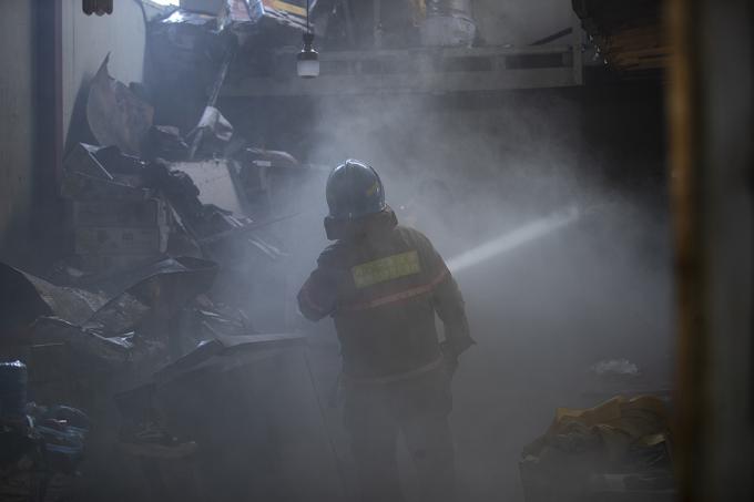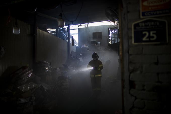 22일 오전 전날 큰 화재가 발생해 피해를 입은 서울 동대문구 청량리 청과물시장에서 소방대원들이 잔불을 정리하고 있다.