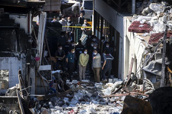 박영선 중소벤처기업부 장관이 22일 오전 전날 큰 화재가 발생해 피해를 입은 서울 동대문구 청량리 청과물시장에서 상황을 보고 받고 있다.