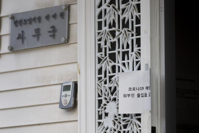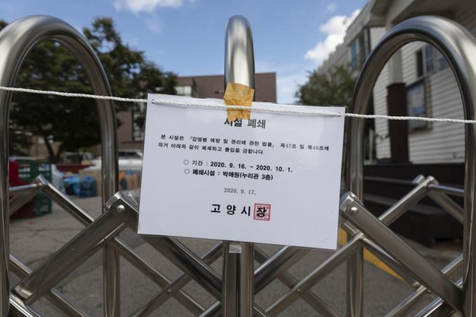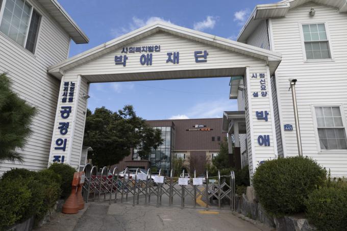 코로나19 집단 감염이 발생해 코호트 격리된 경기 고양 정신요양시설 박애원에서 10명이 추가로 확진된 가운데 24일 오전 해당 건물 입구에 폐쇄 안내문이 붙어 있다. 고양시에 따르면 지난 15일 박애원 근무자 1명이 인천에서 확진 판정을 받은 후 23일까지 관련 확진자는 모두 38명으로 확인됐다.
