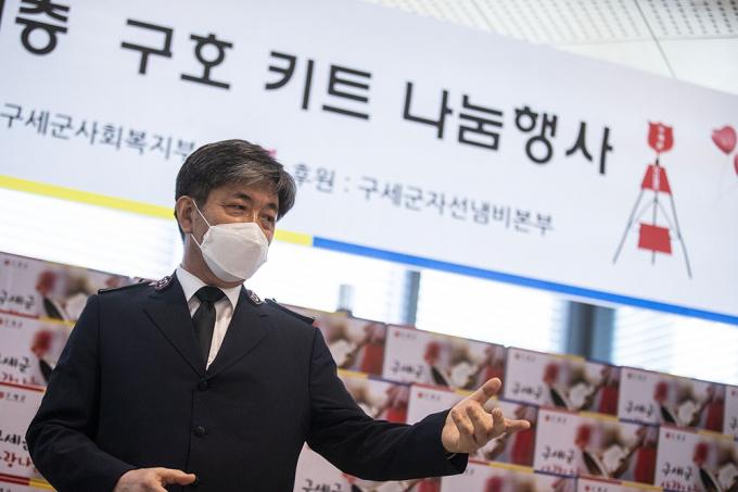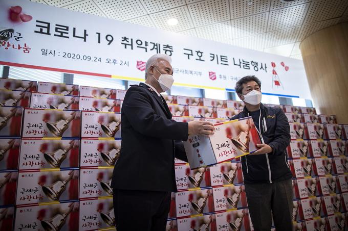 이충호 구세군 서기장관이 24일 오후 서울 서대문구 구세군빌딩에서 열린 2020년 추석맞이 코로나19 취약계층 구호 키트 나눔행사에서 구호키트를 전달하고 있다.