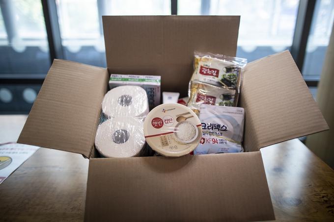 전국 취약계층 8500가정에게 전달될 마스크, 손소독제 등 다양한 생필품과 식료품으로 구성된 코로나19 구호 키트.