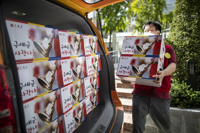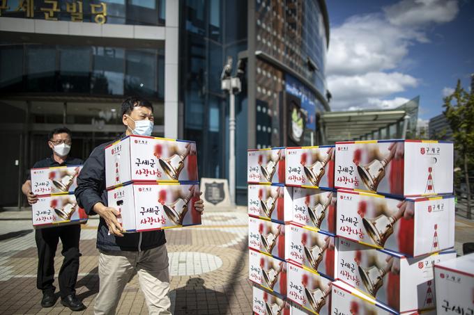 24일 오후 서울 서대문구 구세군빌딩에서 열린 2020년 추석맞이 코로나19 취약계층 구호 키트 나눔행사에서 관계자들이 남대문쪽방 등 취약계층에 보낼 코로나19 구호 키트를 차량에 옮기고 있다.