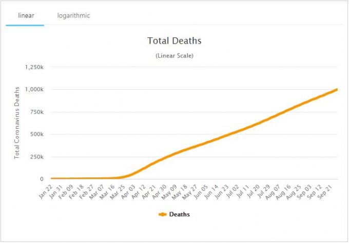 국제통계사이트 월드오미터에 따르면 28일 오전 8시 27분(한국시간) 기준 전 세계 코로나19 사망자는 100만2130명이다.