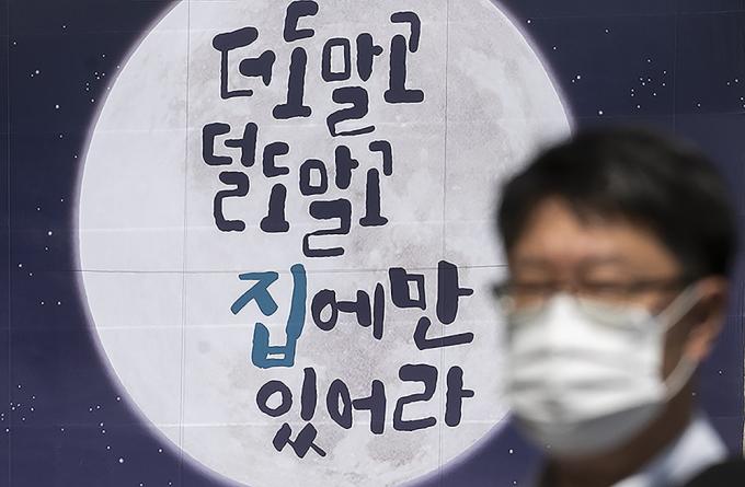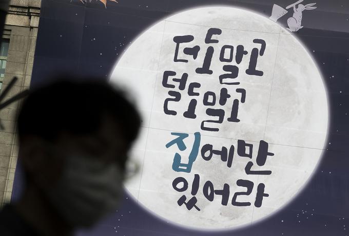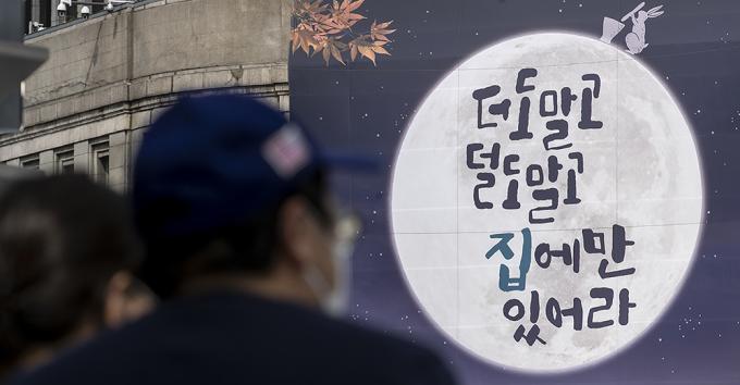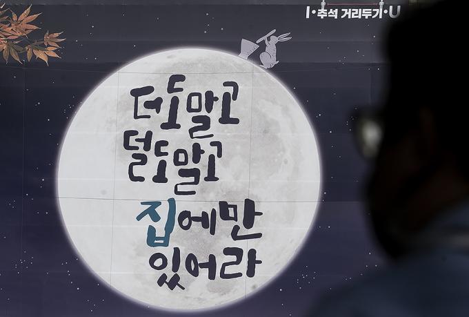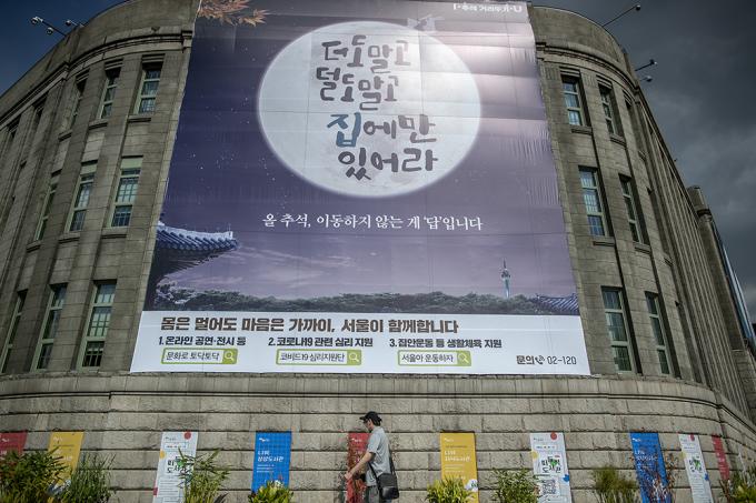 추석 연휴를 이틀 앞둔 28일 오후 서울 중구 서울도서관 외벽에 추석연휴 코로나19 확산 방지를 위한 시민들의 이동자제 참여를 독려하는 '더도 말고 덜도 말고 집에만 있어라'라고 쓰여있는 현수막이 걸려있다.