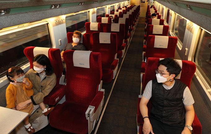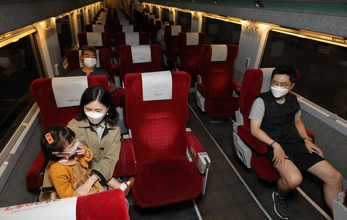 추석 연휴를 하루 앞둔 29일 오전서울 용산구 서울역에서 류현민(32), 김희진(32) 씨 부부가 딸 류지안(3) 양과 함께 창가 양끝으로 배정된 열차 좌석에 앉아 있다.
