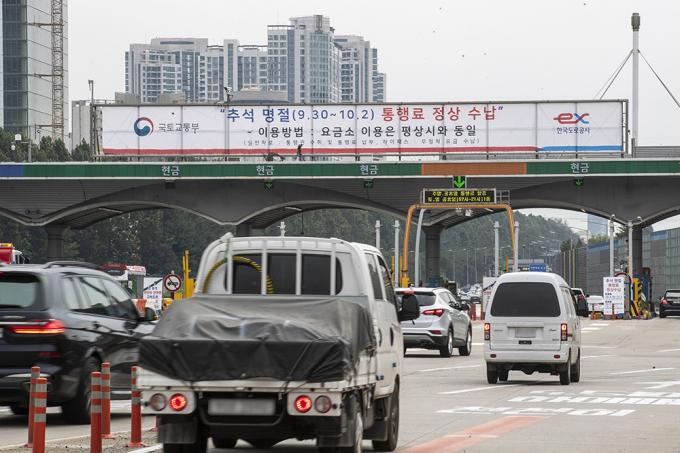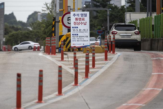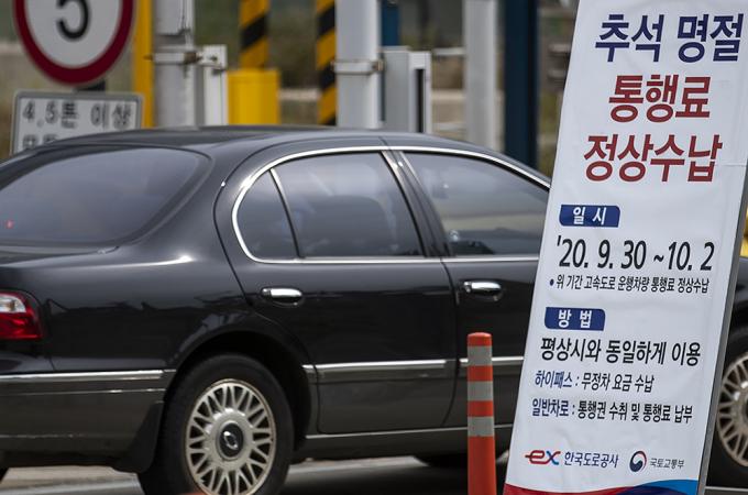 추석 연휴를 하루 앞둔 29일 오전 경기도 성남시 서울톨게이트에 추석 명절기간 고속도로 통행료 정상 수납 안내문이 설치되어 있다. 한국도로공사는 오는 30일부터 내달 2일까지 추석 명절 기간동안 고속도로 통행료를 정상 징수한다고 밝혔다. 그동안 명절기간엔 고속도로 통행료를 면제해왔으나 올해는 코로나19 확산 방지 등의 이유로 유료로 운영한다. 이번 명절 기간 통행료는 휴게소 방역 인력 및 방역 물품 확충 등에 사용될 예정이다.