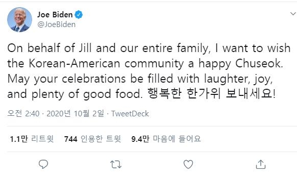 바이든 전 부통령은 1일(현지시간) 자신의 트위터를 통해 "질(부인인 질 바이든 여사)과 우리 식구 전체를 대신해 한국계 미국인 공동체에 행복한 추석을 기원하고 싶다"고 말했다.