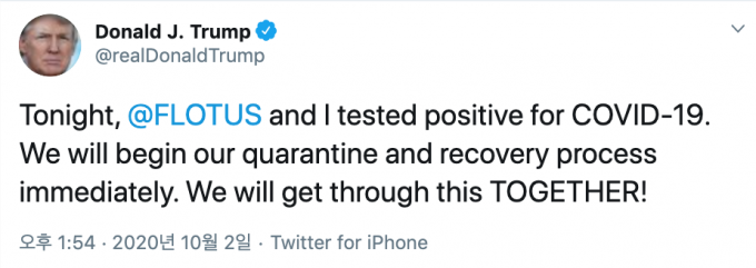 트럼프 대통령은 2일 오전(현지시간) 자신의 트위터 계정을 통해 "코로나19 양성판정을 받았다"면서 "즉시 자가격리와 회복 절차를 진행하겠다"고 밝혔다.