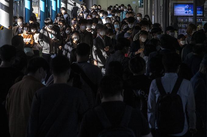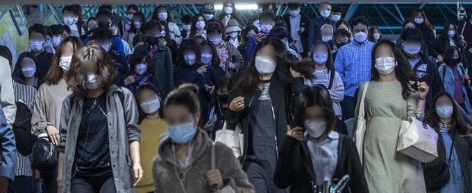 추석 연휴가 끝난 5일 오전 서울 구로구 신도림역 1호선 승강장에서 마스크를 쓴 시민들이 출근길에 발걸음을 서두르고 있다. 박능후 중앙재난안전대책본부 1차장은 이날 오전 중대본 회의에서 "추석 연휴 동안 총 312명의 확진자가 발생했으며, 평소보다 지역 간 이동과 사람 간 접촉이 증가한 것을 고려하면 긴장의 끈을 놓기 어렵다"며 "오는 11일까지는 특별방역 기간으로 지속적인 실천이 필요하다"고 말했다.