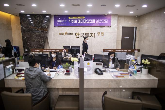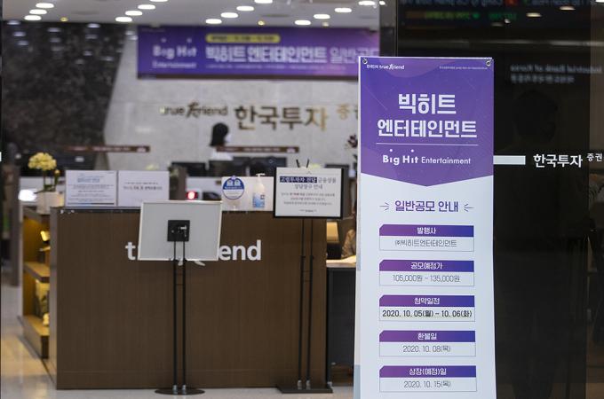 그룹 방탄소년단(BTS)의 소속사이자 올 하반기 공모주에서 대흥행을 예고하고 있는 빅히트엔터테인먼트의 일반 공모 청약이 시작된 5일 오후 서울 영등포구 여의도 한국투자증권 영업점에서 고객들이 상담을 하고 있다. 이날 이틀간 일반 청약을 거쳐 오는 15일 코스피에 상장하는 빅히트엔터테인먼트는 오전 10시 청약 개시 1시간 만에 증거금 2조 원 이상이 모이는 등 뜨거운 투자 열기를 보이고 있다. 빅히트엔터테인먼트의 공모가는 주당 13만5000원이며, 공모 주식 수는 713만 주, 총 4조8000억 원 규모다.