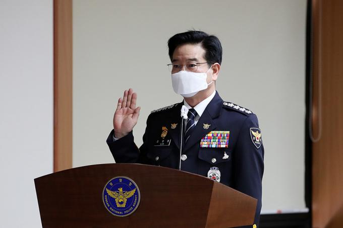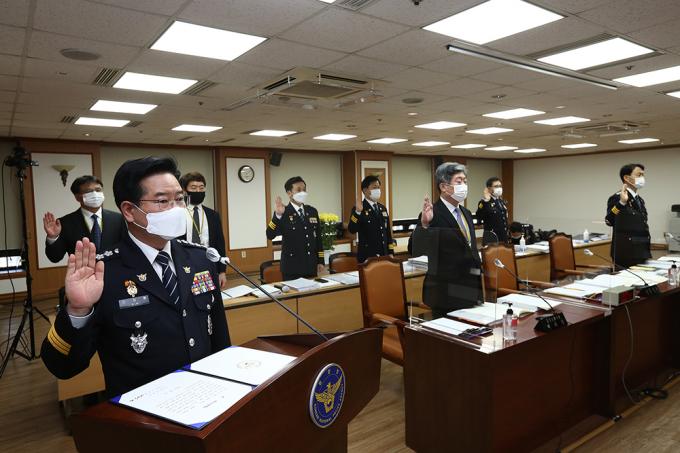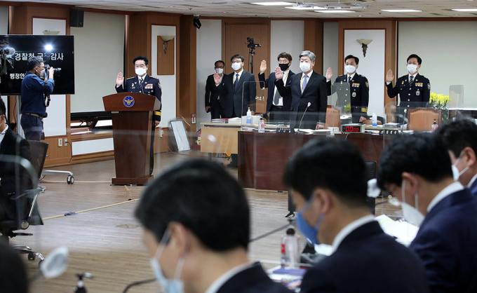 김창룡 경찰청장이 8일 서울 서대문구 경찰청에서 열린 국회 행정안전위원회 경찰청 국정감사에서 선서를 하고 있다.