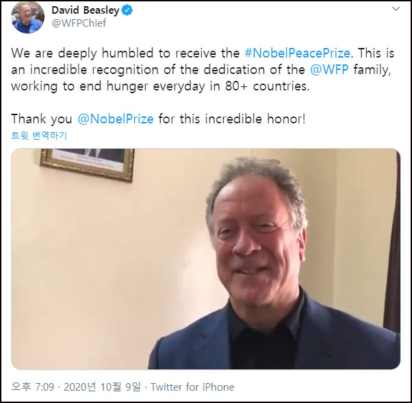 비슬리 WFP 사무총장은 노벨상 발표 직후 트위터에 영상을 올리고 "믿을 수 없다"며 "겸허한 마음으로 상을 받겠다"고 했다.