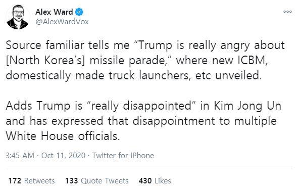 미국 인터넷 매체 복스 소속으로 외교·안보 분야를 담당하는 알렉스 워드 기자는11일(현지시간) 트위터 계정에 "ICBM과 자체 제작한 트럭 발사대가 공개된 북한의 열병식에 대해 트럼프가 진심으로 화를 냈다고 가까운 소식통이 전했다"고 썼다.