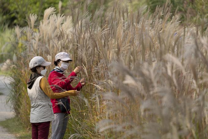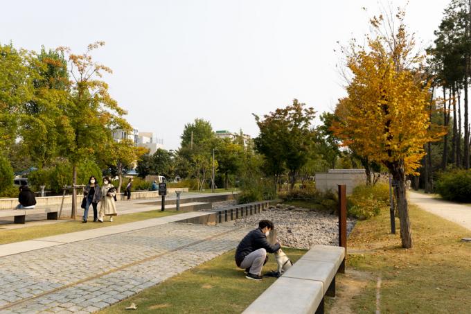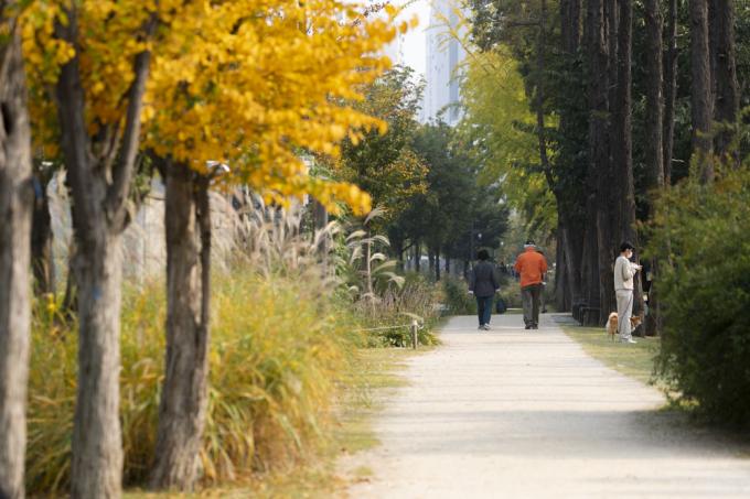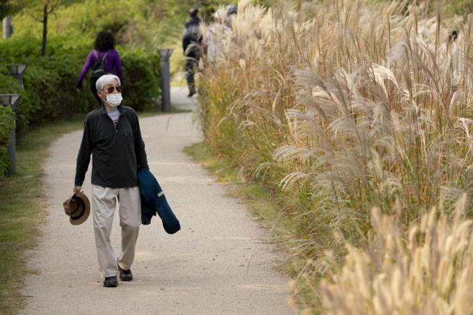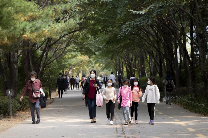 사회적 거리두기 1단계 전환 첫날인 12일 오후 서울 마포구 경의선숲길에서 마스크를 착용한 시민들이 가을을 만끽하고 있다.