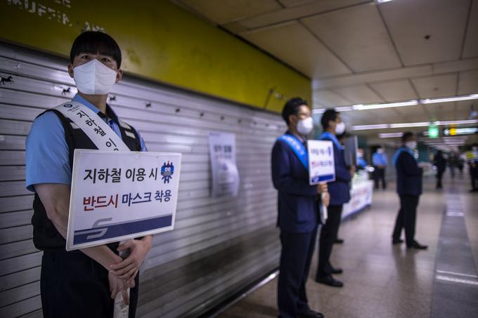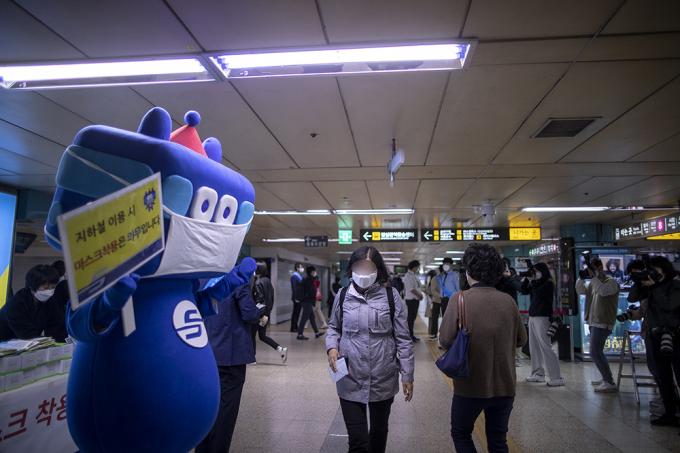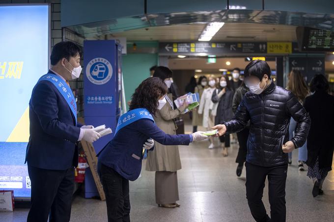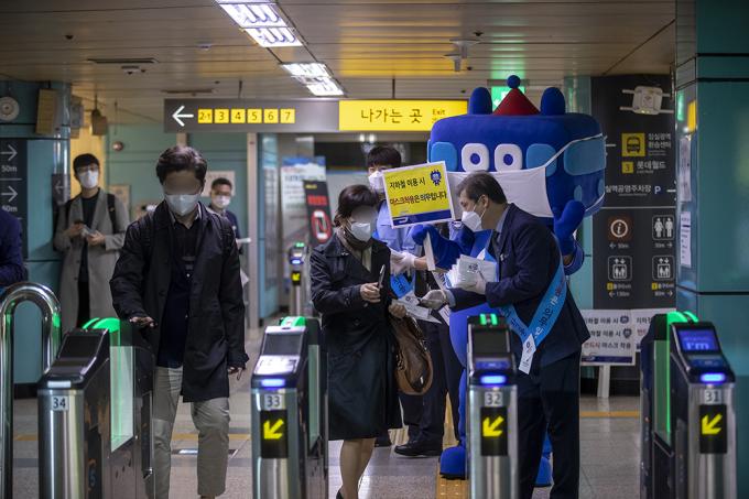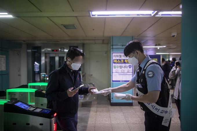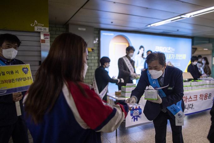 코로나19 확산 방지를 위한 마스크 착용 의무화 첫날인 13일 오전 서울 송파구 잠실역에서 서울교통공사 관계자들이 출근하는 시민들에게 마스크를 나눠주며 대중교통 마스크 미착용 시 과태료 부과 시행 홍보 캠페인을 하고 있다.