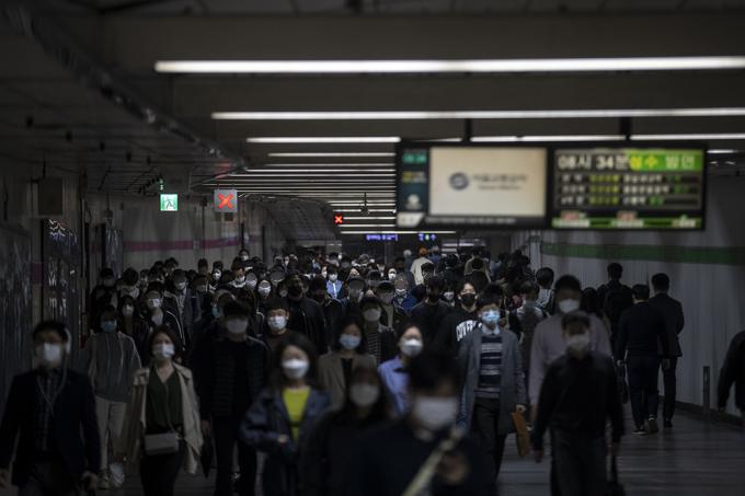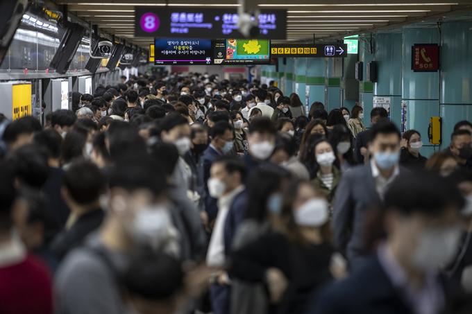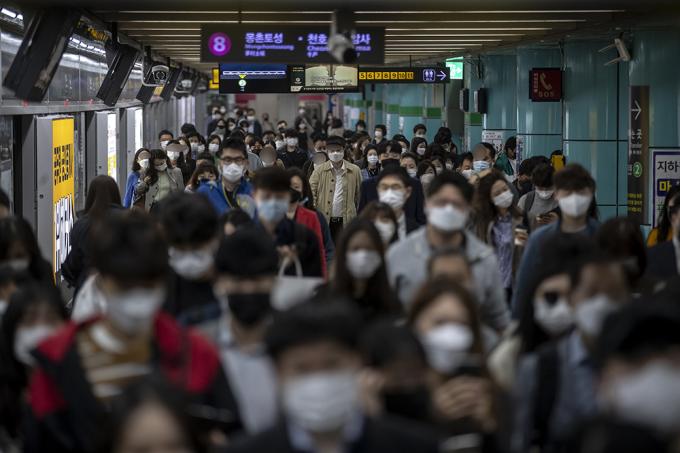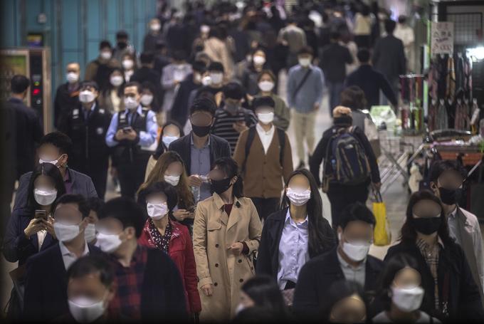 코로나19 확산 방지를 위한 마스크 착용 의무화 첫날인 13일 오전 서울 송파구 잠실역에서 마스크를 쓴 시민들이 출근길에 발걸음을 옮기고 있다.