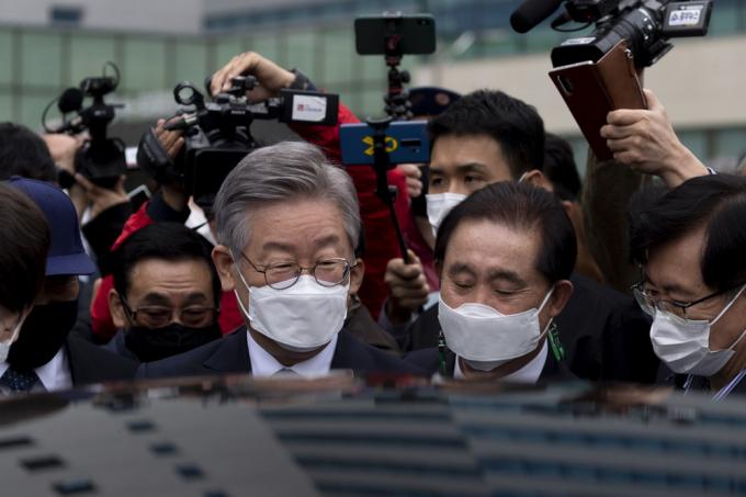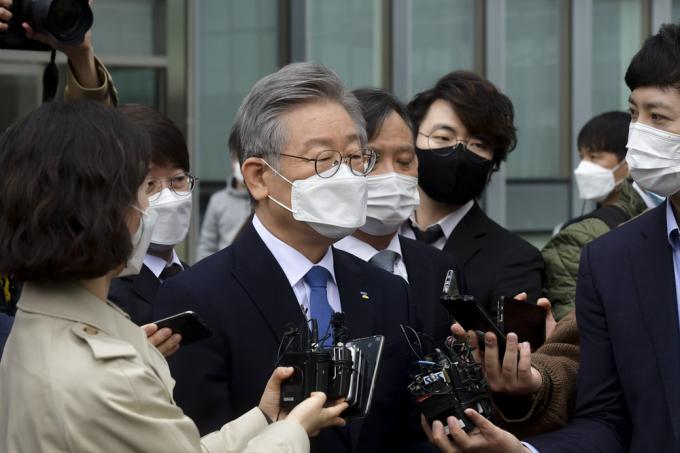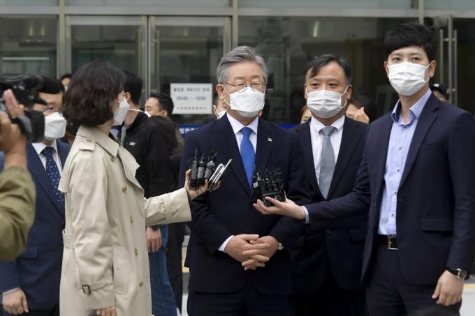 이재명 경기도지사가 16일 오전 경기 수원고등법원에서 열린 공직선거법 위반 혐의 파기환송심 선고 공판에서 무죄를 선고 받은 뒤 취재진 질문에 답하고 있다.