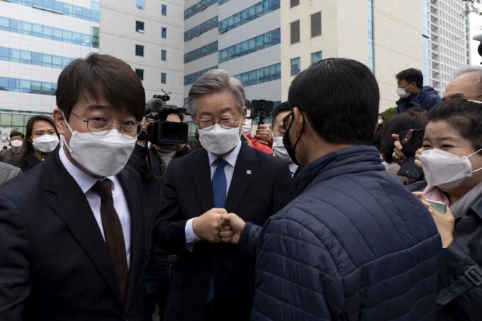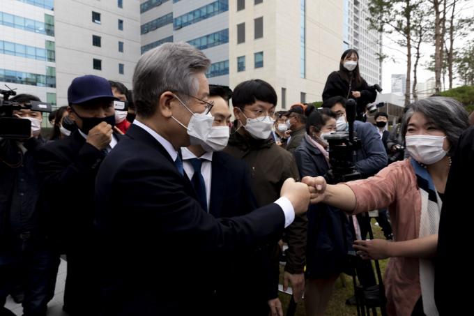 이재명 경기도지사가 16일 오전 경기 수원고등법원에서 열린 공직선거법 위반 혐의 파기환송심 선고 공판에서 무죄를 선고 받은 뒤 지지자들과 인사하고 있다.