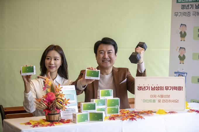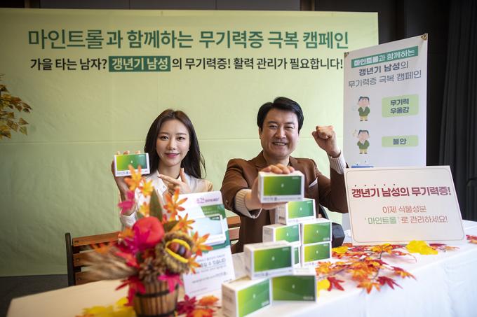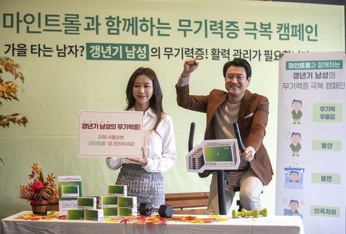 22일 오전 서울 중구 더플라자호텔에서 열린 동국제약 무기력증 극복 캠페인에서 모델들이 무기력증 개선제 마인트롤을 선보이고 있다.동국제약은 갱년기 남성에게 무기력증 관리의 필요성을 전달하기 위한 마인트롤과 함께하는 무기력증 극복 캠페인을 진행했다. 중년 남성이 가을에 겪는 우울감이나 무기력감을 계절성 우울증이 아닌 남성 갱년기의 심리적 증상일 수 있다는 점을 알리고 관리하자는 메시지를 전달하기 위해 마련됐다.