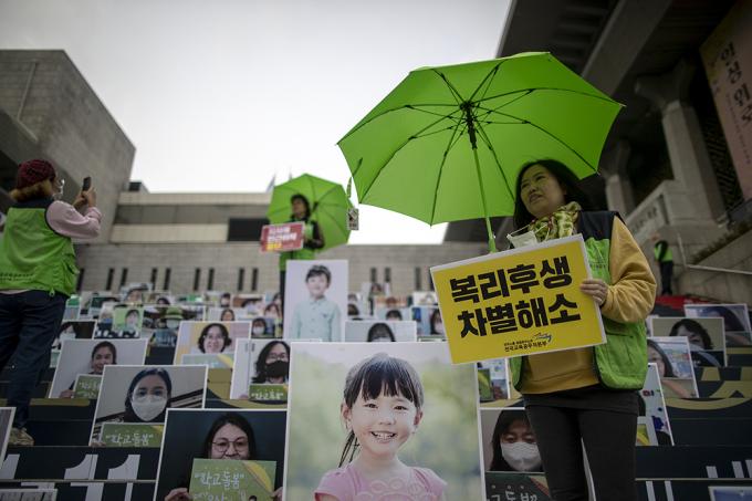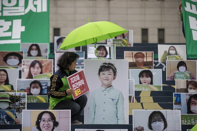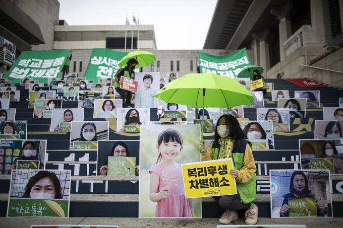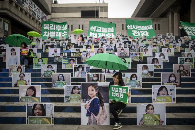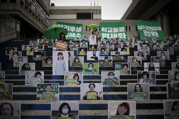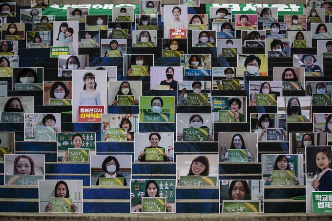 전국교육공무직본부 회원들이 22일 오전 서울 종로구 세종문화회관 계단에서 돌봄파업 상징 퍼포먼스를 하고 있다. 이들은 "코로나19 시기 돌봄파업을 준비하며 대규모 집회를 통해 파업의 결의를 밝힐 수 없어 돌봄파업을 이끄는 돌봄전담사 200명의 인물사진을 통해 파업 의지와 요구를 밝힌다"고 말했다.