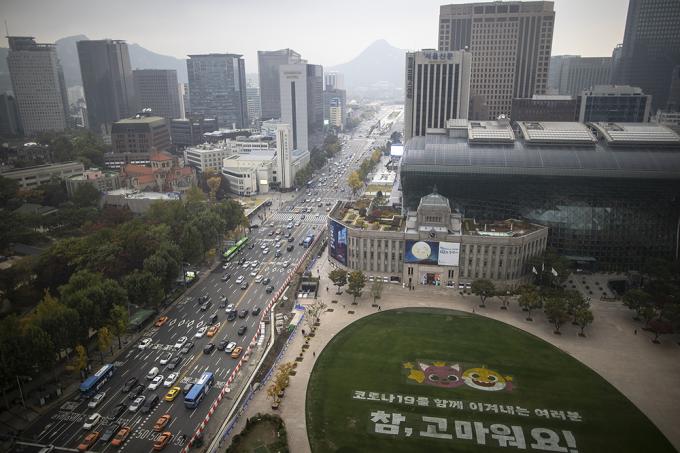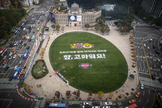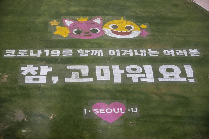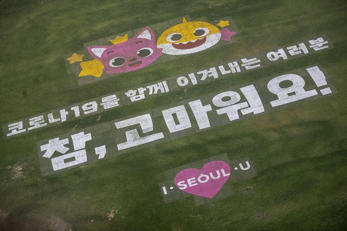 22일 오전 서울 중구 서울광장에서 인기 캐릭터 핑크퐁, 아기상어 그림과 함께 코로나19로 지친 시민들을 위로하는 '참, 고마워요!' 캠페인이 열리고 있다. 서울시는 인기 캐릭터 핑크퐁, 아기상어와 함께 코로나19로 지친 시민들을 위로하기 위한 캠페인을 한 달간 진행한다. 캠페인 기간 시청사, 남산서울타워, 동대문디자인플라자, 세종문화회관, 세빛섬에 핑크퐁 색깔인 분홍조명이 켜진다.