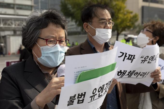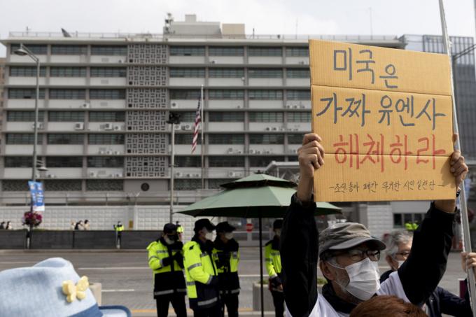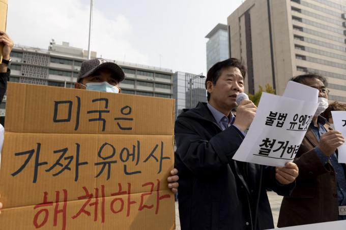 리미일(왼쪽) 코리아국제평화포럼 이사가 22일 오후 서울 종로구 미국대사관 앞에서 '국제연합의 날 75주년-유엔사 해체 촉구 기자회견'을 하고 있다.