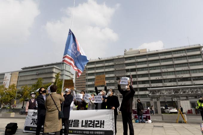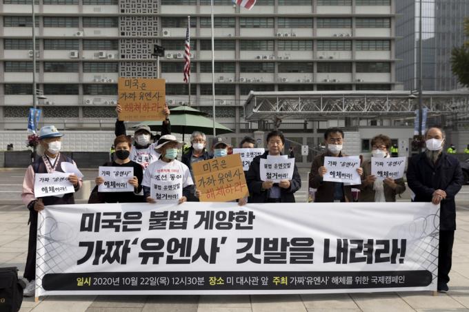 시민단체 '가짜 유엔사 해체를 위한 국제캠페인'이 22일 오후 서울 종로구 미국대사관 앞에서 '국제연합의 날 75주년-유엔사 해체 촉구 기자회견'을 마치고 유엔깃발 하강식 퍼포먼스를 하고 있다.