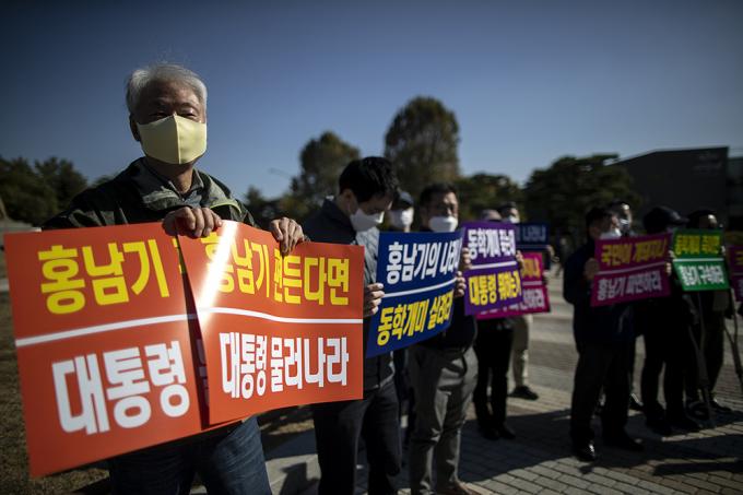 한국주식투자자연합회 회원들이 23일 오후 서울 종로구 청와대분수대 앞에서 대주주 양도소득세 3억원 강행 규탄 기자회견을 하고 있다. 이들은 "정부가 주식 양도소득세를 부과하는 대주주 양도세 기준 강화 방안에 대해 한 종목 3억원 이상 보유자를 납세자로 삼는 것은 공평 과세에 어긋난다"고 말했다.