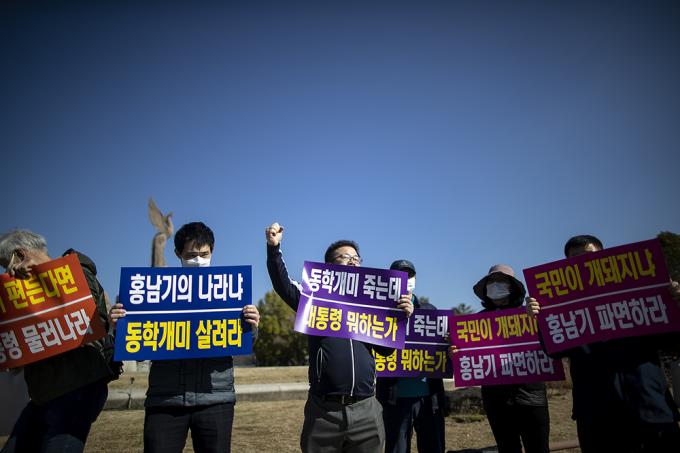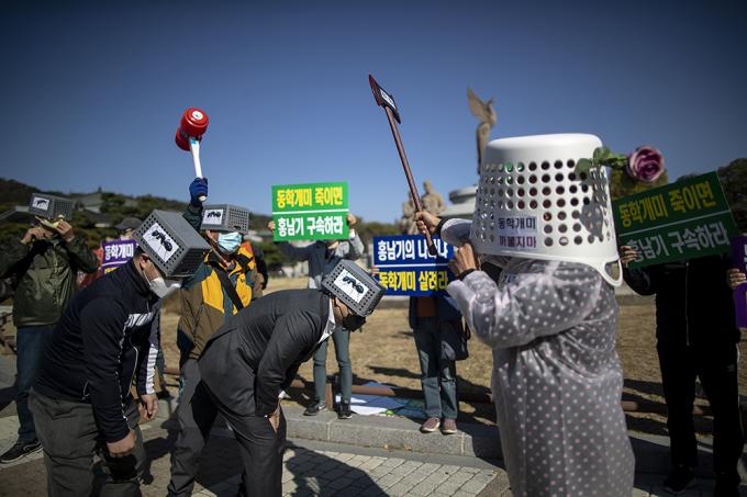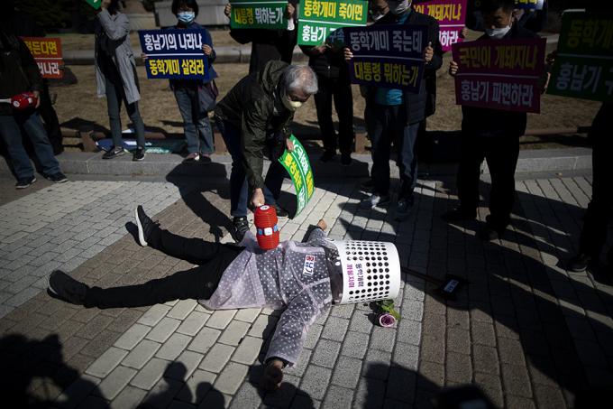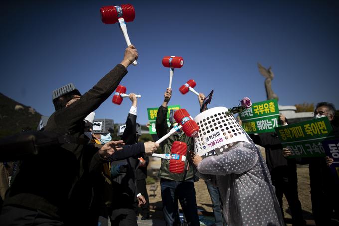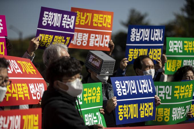 한국주식투자자연합회 회원들이 23일 오후 서울 종로구 청와대분수대 앞에서 열린 대주주 양도소득세 3억원 강행 규탄 기자회견에서 정부의 주식 양도소득세 부과하는 대주주 기준 강화를 규탄하는 퍼포먼스를 하고 있다.