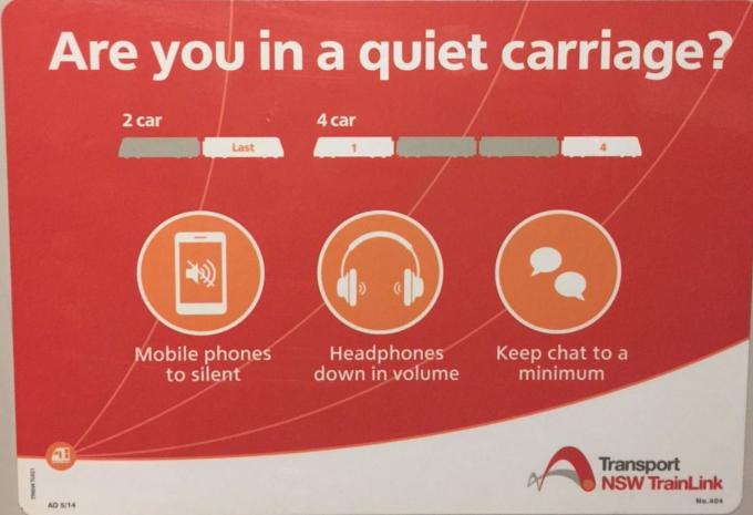 2012년 호주 시드니에 도입된 조용한 객차의 규칙은 크게 세 가지다. 승객들은 휴대전화를 무음으로 바꾸거나 꺼야 한다. 승객 간에는 최소한의 대화만 가능하다. 이어폰 또는 헤드폰 소리도 작게 해야한다. 또한 열차의 출발과 정차를 알리는 음성방송도 모니터 안내로 대체된다.