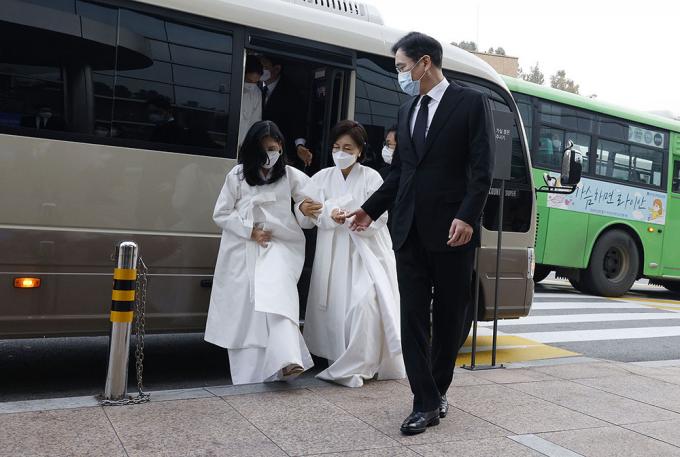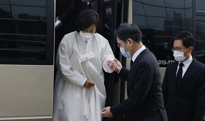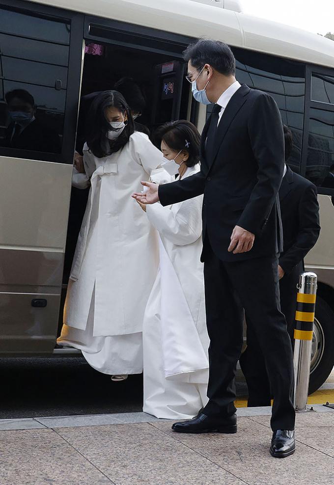 이재용 삼성전자 부회장, 홍라희 전 리움미술관장, 이서현 삼성복지재단 이사장, 이부진 호텔신라 사장이 28일 오전 서울 삼성서울병원 암병원 강당에서 열리는 영결식에 참석하고 있다.