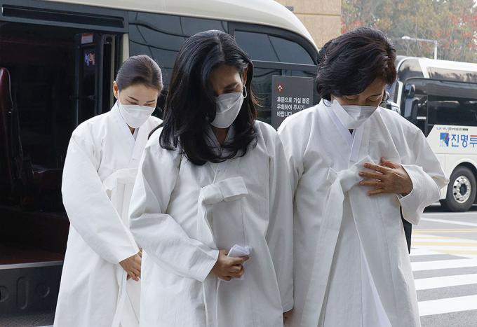 홍라희 전 리움미술관장, 이서현 삼성복지재단 이사장, 이부진 호텔신라 사장이 28일 오전 서울 삼성서울병원 암병원 강당에서 열리는 영결식에 참석하고 있다.