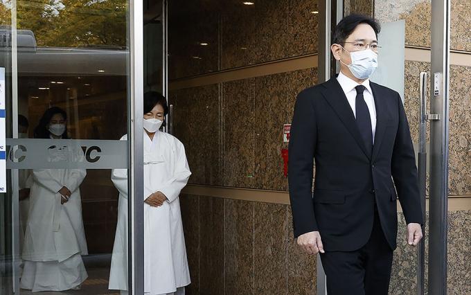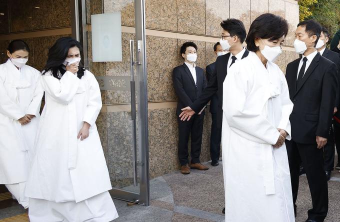 이재용 삼성전자 부회장, 홍라희 전 리움미술관장, 이서현 삼성복지재단 이사장, 이부진 호텔신라 사장이 28일 오전 서울 삼성서울병원 암병원 강당에서 열리는 영결식을 마친 뒤 나서고 있다.