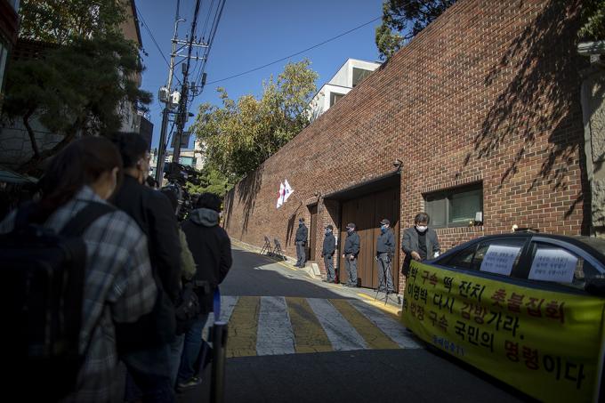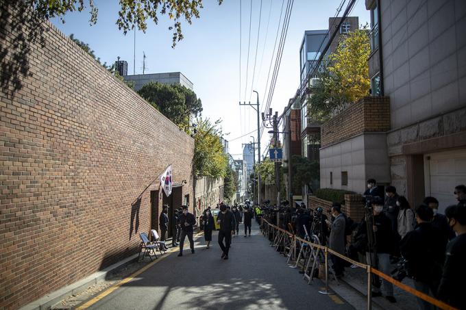 이명박 전 대통령의 횡령, 뇌물수수 상고심에서 징역 17년이 확정된 29일 오후 서울 논현동 이 전 대통령의 자택 앞에 취재진이 모여 있다.