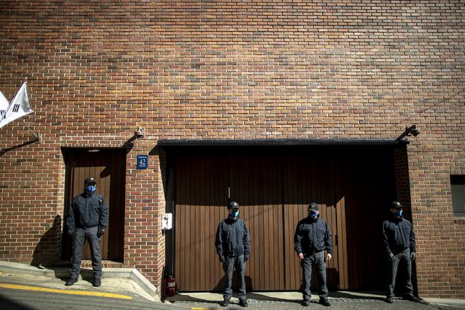 이명박 전 대통령의 횡령, 뇌물수수 상고심에서 징역 17년이 확정된 29일 오후 서울 논현동 이 전 대통령의 자택 주변을 경찰이 지키고 있다.