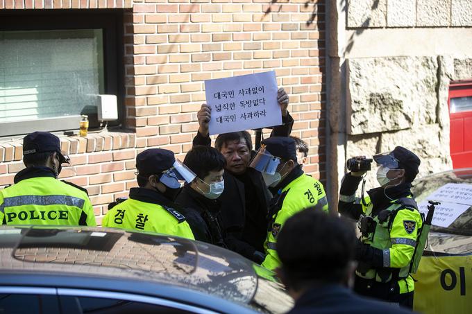 이명박 전 대통령의 횡령, 뇌물수수 상고심에서 징역 17년이 확정된 29일 오후 서울 논현동 이 전 대통령의 자택 앞에서 한 시민이 피켓 시위를 벌이고 있다.