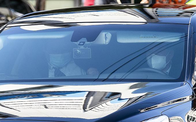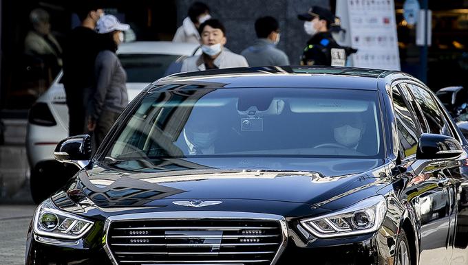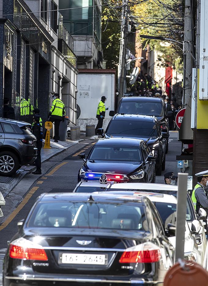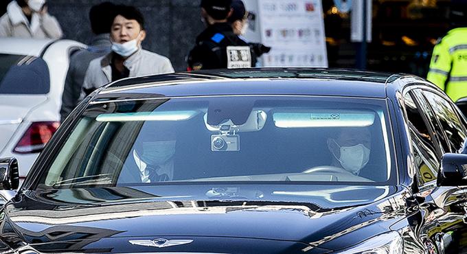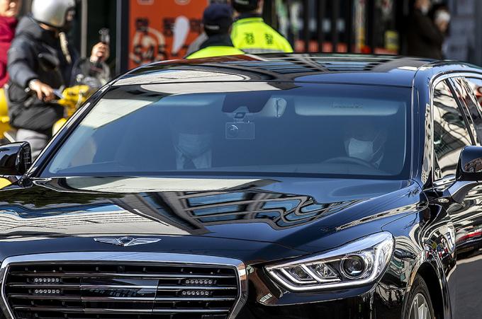 회사 자금 횡령과 뇌물 수수 등의 혐의로 징역 17년형을 확정받은 이명박 전 대통령이 탑승한 차량이 2일 오후 서울 강남구 논현동 자택에서 동부구치소로 재수감되기 전 서울 서초구 서울중앙지방검찰청으로 출석하기 위해 자택을 나서고 있다.